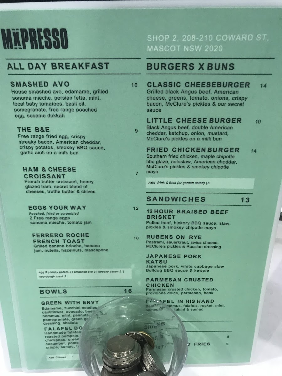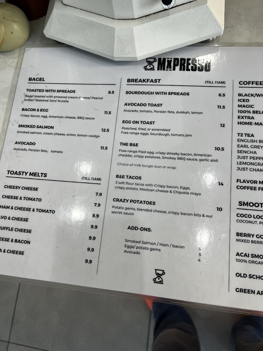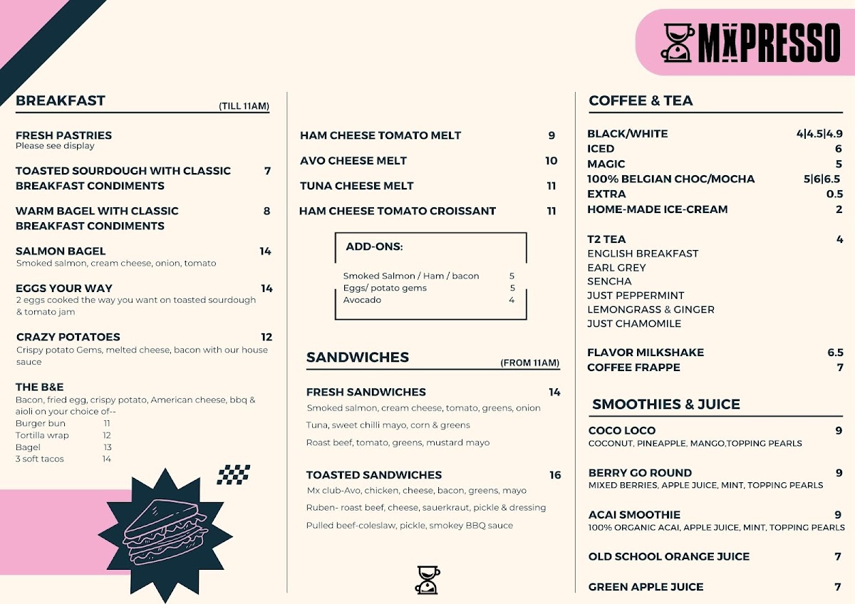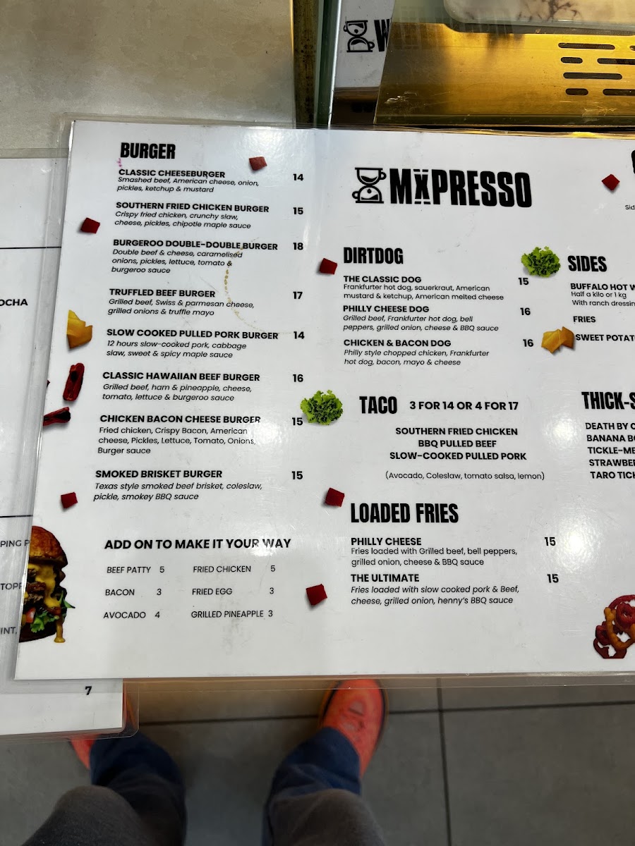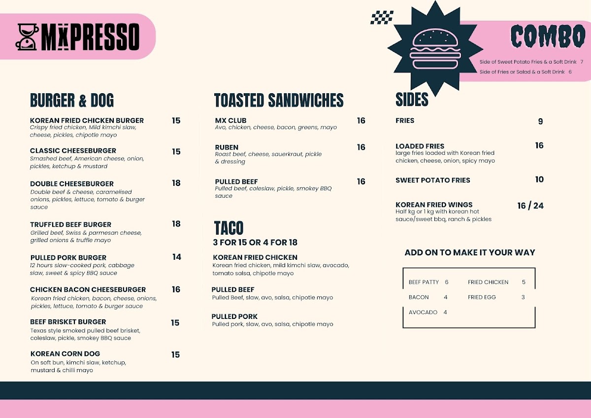 The menu at Mxpresso Cafe Mascot offers a delightful array of dishes catering to various tastes. For breakfast, you can indulge in Fresh Pastries or enjoy a savory Ham Cheese Tomato Melt or Avo Cheese Melt, each providing a satisfying start to the day. Their coffee selection features refreshing options such as Iced Magic and 100% Belgian Choc/MochaExtra, paired perfectly with homemade ice creams. Sandwich lovers will appreciate options like the Mx Club, Ruben, and Pulled Beef sandwiches, ideal for a hearty lunch. If you're in the mood for something refreshing, the Coco Loco, Berry Go Round, and Acai Smoothie smoothies are perfect choices. The bagel selection includes options like Bacon & Egg and Smoked Salmon Avocado, offering a deliciously varied experience. Toasty Melts such as the Cheesy Cheese and Ham & Cheese & Tomato cater to those looking for a comforting bite. For burger enthusiasts, the Korean Fried Chicken Burger and Truffled Beef Burger are standout options, while sides like Loaded Fries and Korean Fried Wings complement the meal. Tacos featuring Korean Fried Chicken and Pulled Pork offer a unique twist to traditional fare. Their burger menu is expansive with choices like the Southern Fried Chicken Burger and the indulgent Double CheeseburgerTruffled Beef Burger. Loaded Fries, available in options like Philly Cheese and The Ultimate, provide a perfect side dish. For those craving something sweet, the Ferrero Roche French Toast and the Smashed Avo are noteworthy picks. Bowls like Green With Envy and Falafel Bo provide lighter alternatives. To round off the experience, their range of teas, such as Earl Grey and Sencha, offers a refreshing finish to any meal.
